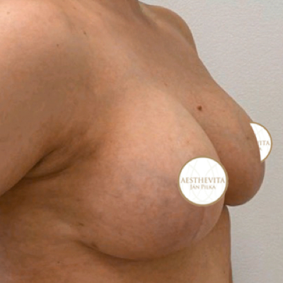 Pokud je kromě zvednutí potřeba i výraznější doplnění objemu, je vhodná modelace s augmentací, tedy zvednutí prsou spojené se zvětšením implantáty. Kombinace řeší tvar i objem v jednom zákroku: prsa se zvednou, přebytečná kůže se odstraní a objem se doplní implantátem, jehož volba a umístění se stanoví individuálně. Na klinice Aesthevita navíc nabízíme i speciální odlehčené implantáty, které mohou být až o 30 % lehčí oproti standardním implantátům.